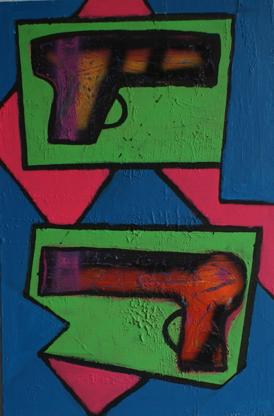 3. Nimrod: Nimrod ist Held und König aus der Bibel und dem Koran und gilt als großer Jäger. Sein Name bedeutet soviel wie „sich widersetzen“ und so soll er gegen Gott rebelliert haben. Im Abschlussbild dieser Kunstserie findet die Personifikation des Elekrogegenstandes Föhn durch eine Assimilation im dargestellten Körper Nimrods. Auch hier findet durch die Titelgebung eine intertextuelle Ebene statt, während vordergründig die malerische Umsetzung der Personifikation im dreckigen Pop-Art-Stil in Verbindung des abstrakten Expressionismus zum Endpunkt vorangetrieben wurde.